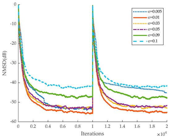 In the simulation experiments, the steady-state error represents the minimum level of error that the system can achieve after a period of time. Ideally the steady-state error should be close to zero. The lower the value obtained in Equation (40), the closer the steady-state error is to zero. In addition, the speed of convergence of the algorithm can be assessed by observing whether the curve representing the algorithm reaches a steady state of convergence quickly; the steady-state error of the algorithm can be assessed by the lowest value when the curve reaches the steady state; the robustness of the algorithm can be assessed by the degree of fluctuation of the curve under different noise disturbances and whether the curve can converge normally and quickly. The tracking performance of the algorithm can be evaluated by whether the algorithm curve can recover quickly when there is a sudden change in the system impulse response and reach the next steady state, and the steady-state error when each algorithm reaches the fastest convergence will be compared in the experiments as a performance evaluation criterion. The data obtained from the experiments were calculated by averaging the results of 200 independent simulations.