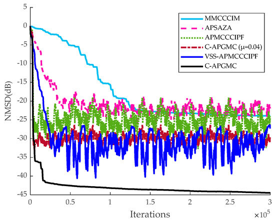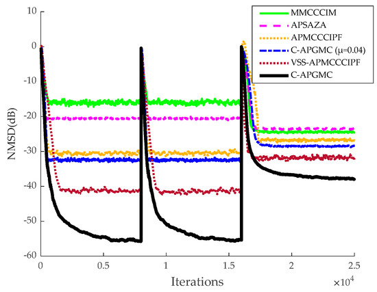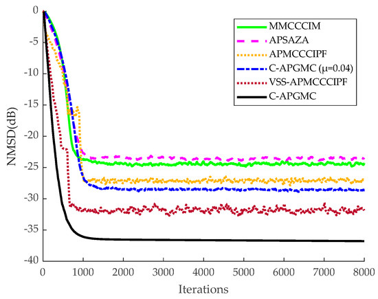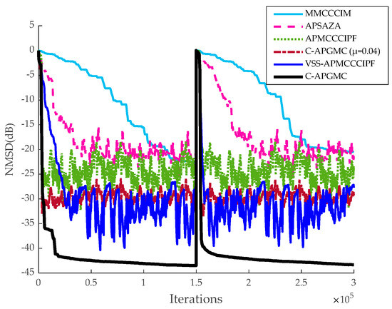 The number of iterations in this experiment was 8000 in the smooth environment and 2.5 × 104 in the non-smooth environment. To ensure that the performance of each algorithm is optimal, the step size is set to μ = 0.08 for the MMCCCIM algorithm, μ = 0.02 for the APSAZA algorithm, μ = 0.04 for the APMCCCIPF algorithm, the kernel width σ = 0.01, and the zero-attraction factor β = 0.0001. For the VSS-APMCCCIPF algorithm, the step size of the variable parameter in the convex combination factor t = 0.98. For the C-APGMC algorithm, α = 3, β = 1, kernel width σ = 0.01, the convex combination factor t = 0.997. The results are shown in the Figure 7, Figure 8 and Figure 9.