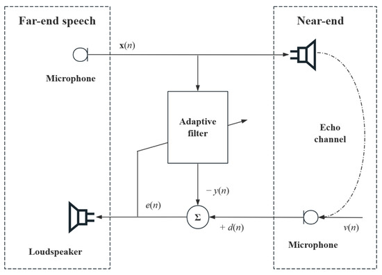 In the field of speech signal processing, adaptive filters can adjust the parameters in real time according to the changes in the input signal to better adapt to the non-stationary signals and unknown system environment [1,2,3], so they have been more widely used in the fields of acoustic echo cancellation and active noise control [4,5,6]. Adaptive filtering methods, including the least mean square (LMS) algorithm based on the minimum mean square error (MSE) criterion and the normalized least mean square (NLMS) algorithm, are widely used due to their relatively short data training time requirements [7,8,9]. The affine projection (AP) algorithm, which uses recycled input signals to speed up convergence, was a significant advancement. Since then, AP-based algorithms have become the dominant choice in adaptive filtering [10].
