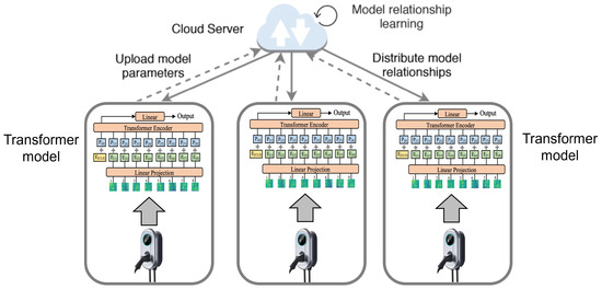 Abnormality detection in charging stations typically relies on locally collected data pertaining to users and the power grid [6,7,8]. These data are processed by predictive modules deployed within individual charging stations to identify anomalies, such as irregular data flows [9,10,11]. However, charging stations are distributed across diverse regions; thus, each station is limited by the scale and characteristics of its local data. These limitations can result in sub-optimal local solutions. A more effective approach involves leveraging the network of charging stations to enable centralized data collection, facilitating real-time global monitoring of data and load variations across stations [12,13]. Centralized federated learning offers a potential solution, wherein a central node periodically aggregates user data or model parameters reported by individual charging stations. The central node then trains a unified model and distributes updated model parameters back to the stations, enabling real-time anomaly detection across the network [14].