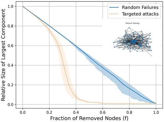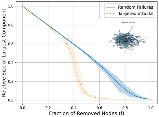 In the random network, we randomly combine individual charging stations and set the network’s degree to 3, 5, or 7. That is, on average, each node has three, five, or seven neighboring nodes. The generated network topology and network robustness are shown in Figure 2, Figure 3 and Figure 4. Here, f represents the percentage of failed charging stations, and the vertical axis indicates the proportion of the remaining network size.