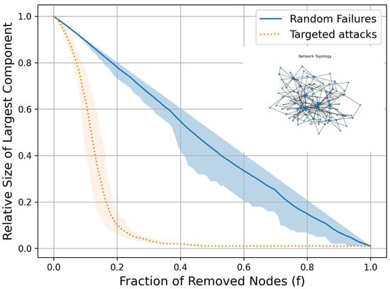 In conclusion, in a distributed network with a predetermined average node degree, the most effective topology for countering both random failures and targeted attacks should have at least one node with degree , while all other nodes maintain a degree of . In Section 6, we will use realistic data to validate the relationship between the network’s degree distribution and its robustness.
