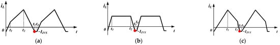 By increasing the switching frequency, the voltage-second of the inductor can be reduced greatly so that the size of the inductor will be shrunk. In applications where high power is urgently needed, high frequency is typically used; for example, pushing the switching frequency to hundreds of kilohertz or even megahertz. Under such a high switching frequency, the switching loss will become large, which will decrease the efficiency. A soft-switching technique can be used to reduce the switching loss. Because the hard switch turning-on loss is typically a few times the turning-off loss, zero-voltage turning-on (ZVS-on) is typically needed [,]. To achieve ZVS-on for the switches, the current should touch a certain negative value, as shown in Figure 2. Compared to the CCM working mode, this will cause a large current variation of the inductor. Therefore, the flux variation in a switching cycle will be large. The FSBB converter operates in three modes: buck, buck-boost, and boost voltage operation. The waveforms of the inductor current under different modes are modified and explained in Figure 2. The red dots represent the current required to achieve ZVS in the circuit. In the buck mode, the input voltage is higher than the output voltage, and the inductor current is depicted in Figure 2a, where the peak of the inductor current occurs at t2 and reaches its maximum value. Figure 2b shows the inductor current waveform when the input and output voltages are close to each other; during the time period t1~t2, the voltage difference across the inductor approaches zero, resulting in a nearly constant inductor current. Figure 2c illustrates the waveform in boost mode, where the peak inductor current occurs at the moment t2. Under the same output voltage and output power, the peak inductor current is larger in buck-boost mode due to the large voltage-second applied on the inductor, making the inductor more susceptible to saturation. Therefore, when designing the inductor, it is essential to ensure that the inductor does not saturate when the current reaches its peak under the worst-case scenario, and there is sufficient margin.