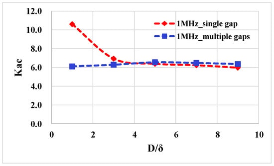 Compared to a single large air gap, quasi-distributed air gaps can be used to reduce the fringing field so that it can reduce the winding loss and keep a small volume of the inductor as well. The winding resistance factor evaluation is shown as the blue dotted line in Figure 4, which takes four segments of air gaps as an example. In contrast to the red line, even if with a very small clearance distance, the winding resistance factor of the inductor with the quasi-distributed air gaps can be kept at the same value as the inductor with a single air gap with a large clearance distance. At the same time, it shows that the winding resistance factor varies little at different clearance distances. However, the winding resistance factor is still significant compared to the windings’ resistance.
