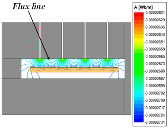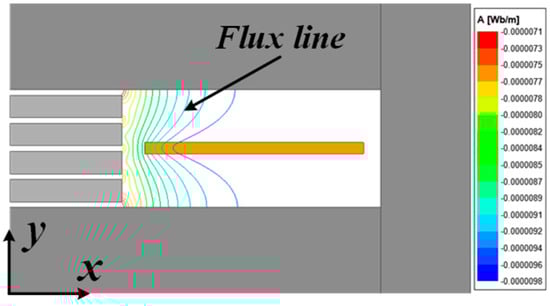 Although the x-component magnetic field is increased when compared to that in the traditional inductor, the magnetic field will penetrate the windings horizontally, which will cause less eddy current due to the copper thickness being very small, which increases the impedance of the eddy current loop. Figure 8 is the simulated flux line distribution, which shows that in the winding region, the flux line is nearly parallel with the windings horizontally. Based on this inductor structure and its electromagnetic characteristics, this paper proposes to describe the inductor as a “parallel magnetic field inductor (PMF inductor).”