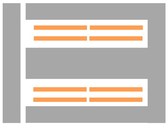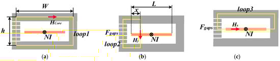 The most important way to reduce the large winding loss due to the non-uniform current distribution is to reduce the magnitude of the alternating magnetic flux that penetrates the planar windings vertically. Thankfully, in the structure with planar windings, the magnetic field can be modified from the vertical form to the horizontal form by modifying the relative position between the windings and the air gaps. As shown in Figure 7, the air gaps are modified to the horizontal core plate and distributed equally along the windings. In Figure 7, the yellow boxes indicate different ampere circuits, the red arrows represent the direction of the magnetic field, and the red voltage source symbol is used here to represent the magnetomotive force source. As shown in Figure 7a, the closed magnetic field loop (loop4) contains three sections: the first one is section A-B, which is in the core without air gaps; the second is section B-C, which is in the core with distributed air gaps; the last section is section C-A which is in a vertical path at an arbitrary position at the x-axis direction. In this loop, the magnetic force applied on section B-C is