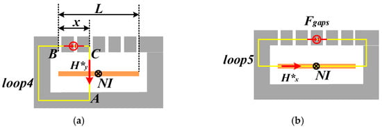 where is the magnetic force applied on the core leg with the quasi-distributed air gaps, and are the Ampere-turns of the windings inside the core window. To verify the magnetic field distribution inside the core window, another closed magnetic field loop (loop2) containing the magnetic field of the left terminal of the windings is drawn in Figure 6b. In this loop, the Y-component magnetic field can be obtained by Ampere’s circuital law:
