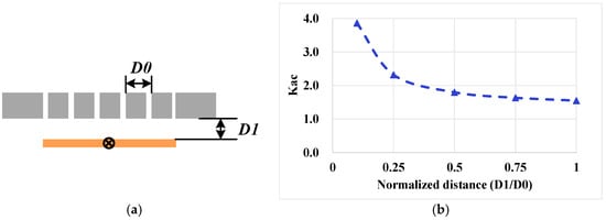 where is the distance between two adjacent air gaps and is the distance between the winding and the core plate. The simulation results show that there is an inflection point around . The magnetic field at the air gap still has a certain diffusion effect, and the magnetic field component perpendicular to the nearby winding generates significant eddy current losses in the winding. The radius of diffusion of the air gap can be approximated as half the distance D0 between adjacent air gaps. As the clearance distance continues to increase, the leakage magnetic field from the air gap will have little impact on the winding. Therefore, in the simulation results of Figure 9b, it can be observed that when the clearance distance exceeds , the change in for the winding becomes significantly slower.