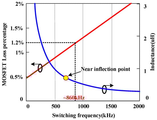 The TI CSD19532Q5B has been chosen as the switching transistor, and under critical soft-switching control mode, the losses of the switching transistor are defined as the sum of conduction loss and switching loss. Under the target that 98% efficiency can be achieved at the rated point, it is expected that the switching loss of the transistor should ideally not exceed 1.2% of the total loss. The switching frequency is also known to affect the size of the inductance; under the same input and output conditions, a higher switching frequency is associated with a smaller inductance, which is beneficial for reducing the size of the inductor. According to the expression for inductance under the critical mode presented in reference [], the curve of inductance variation with switching frequency can be plotted to assess its impact. The estimated curves for switching loss and inductance variation with frequency are shown in Figure 10, where the red curve represents the variation of switching loss with frequency, and the blue curve represents the maximum inductance variation with switching frequency. It can be observed from the figure that the loss of the MOSFET increases continuously with the increase in switching frequency. If it is anticipated that the switching loss remains below 1.2%, it is recommended that the switching frequency be less than approximately 860 kHz (denoted in red font in Figure 10), allowing for some margin. The required inductance is seen to decrease as the switching frequency increases, but an inflection point (the yellow dotted point) is exhibited by this curve between 600 and 800 kHz. Beyond this frequency, the rate of decrease in inductor size is observed to slow as the switching frequency increases. Considering all the above, 800 kHz is selected as the switching frequency of the circuit.
