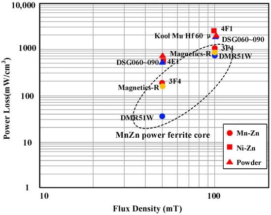 Figure 11 presents the losses of several common magnetic materials, including manganese-zinc (Mn-Zn) power ferrite (circle dot), nickel-zinc (Ni-Zn) power ferrite (square dot), and powder cores (triangular point), at various frequencies. Amorphous materials and nanocrystalline strips are typically recommended for operating frequencies below 200 kHz, rendering them unsuitable for the frequency range relevant to the inductors discussed in this paper; thus, they have been excluded from the comparison. As illustrated in Figure 11, Mn-Zn power ferrite is shown to demonstrate relatively favorable loss characteristics, as marked within the dashed circle, establishing it as the preferred material for the inductor design presented herein.