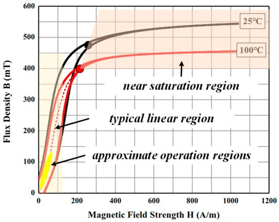 To minimize core loss as much as possible, the inductor uses a Mn-Zn power ferrite core, DMR51W, as the core material. To maintain a relatively constant inductance, it is essential for the inductor to operate as much as possible in the linear region of the B-H curve, as shown in Figure 12. Based on the actual operating conditions of this work, the approximate operating regions are indicated as the yellow regions in Figure 12.