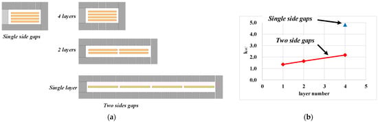 Modified core air gaps and layers and kAC simulation: (a) different inductor structure, (b) kAC for different inductor structure.