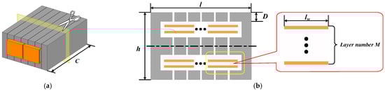 Based on the above analysis, the proposed FSBB inductor has copper foil windings and distributed air gaps in both the center core leg and the side legs. Figure 14 shows the profile of the inductor in which the length perpendicular to the plane direction is denoted as , the thickness of the top side core plate is denoted as , the total height of the core is , the width of the inductor is , the width of the winding is and the winding layer number is . The magnetic field is assumed to be a 1D distribution, so that the winding resistance is referred to []. On account that the current flowing through the windings is not a standard sine waveform, a high order current is considered, which is obtained by the Fast Fourier Transform (FFT) of the simulated waveforms. The winding loss of the inductor is