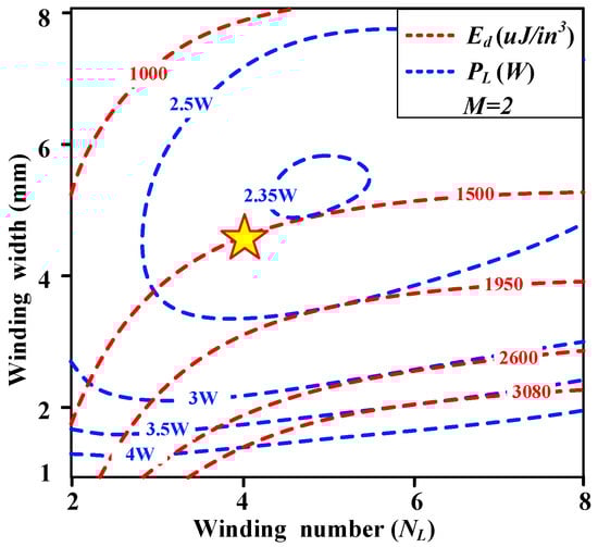 In Figure 15, the total loss and the power density of the inductor are drawn to give a big map of the parameters design of the proposed inductor. The blue lines are the contour lines of the total loss of the inductor, and the red lines are the contour lines of the defined power density of the inductor. These parameters will decide the total loss and the power density of the inductor: the total winding number the width per turn, the thickness of the winding copper , the winding layer number and the maximum flux density of core . It is very complex to optimize each value at the same time, so in this paper, some parameters are pre-determined by experience, such as the copper foil thickness chosen as , and . In Figure 15, the x-axis is chosen as the winding number, and the y-axis is chosen as the winding width. The last variable is the winding layer number , which is evaluated by the enumeration method. In the situation of this work, the most reasonable value is . To have a compromise between the loss and the volume, the final selection point is chosen at the point of the star location. At the star point, the loss nearly approaches the minimum point, and having an even number of turns makes it easier to wind within two layers.