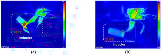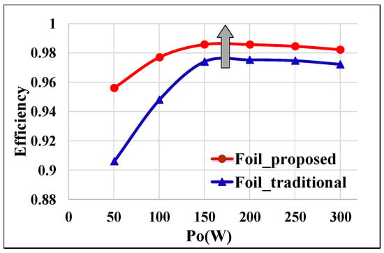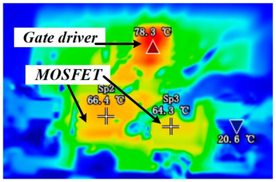 To verify the advantage of the proposed inductor structure, the same foil winding inductor with the traditional air gaps in a single side of the core is made to have a fair comparison. Figure 16 and Figure 17 show the profiles of the conventional inductor and the proposed inductor. The measured efficiency of the inductor with traditional gaps and the proposed air gaps are shown in Figure 18. The red dotted line is the foil winding inductor with conventional air gaps, and the red solid line is the efficiency with the proposed inductor. These comparable efficiency curves show that the total efficiency has improved significantly, as indicated by the gray arrow. Figure 19 shows the thermal imaging of the switching power device section of the FSBB converter studied in this paper. As shown in the figure, the highest temperature point (the brightest color) is the gate driver, followed by the MOSFET temperature. The blue area is close to room temperature, and the closer the color is to blue, the lower the temperature. The losses of the switching devices directly affect the temperature rise of the devices. Since the junction temperature of switching devices typically has limitations, the temperature rise can be estimated by multiplying the device losses by the thermal resistance RθJA from the internal nodes of the device to the ambient temperature, i.e., ΔT = PMOS × RθJA. Other components, such as gate drivers and inductors, can also be estimated using a similar model. However, the structure of inductors is relatively complex, and it is challenging to accurately determine the thermal resistance for the inductors. This will be further investigated in our future work. Figure 20 shows the thermal images under full load conditions after 3 min. The testing was performed with the entire setup exposed to an external airflow of approximately 2 m/s, and the indoor ambient temperature was around 20 °C. Figure 20 indicates that the inductor winding temperature with traditional air gaps exceeds 100 °C soon, and in contrast, the winding temperature with the proposed design is only lower than 40 °C (as shown in the dashed box). These testing results prove that the proposed magnetic field regulation method can greatly reduce the winding loss. Thermal analysis and management are crucial aspects of converter design. Ref. [] provides a detailed analysis of thermal risk factors in wireless charging and proposes a method for analyzing and managing thermal risks through an electromagnetic–thermal coupling model. To enhance the thermal performance of the inductor proposed in this paper, it is essential to ensure the consistency of the thickness of the multi-segment air gaps to create a more uniform magnetic field. Additionally, while maintaining adequate insulation strength, efforts should be made to minimize the thickness of the insulation material in the foil winding.