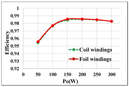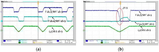 Additionally, another comparison measurement is also tested with an inductor whose windings are replaced by silk-covered multi-strand wires with the same sectional area. The photos of these two types of inductors are shown in Figure 21. These efficiency curves are shown in Figure 22, which shows that the inductor designed in this paper can reduce the winding loss the same as the traditional inductor with coil windings. Figure 23 gives the key waveforms of the FSBB converter at 48 V-to-48 V with full load conditions, which shows that ZVS has been achieved for the switches (as shown in the dashed circle). To maintain ZVS implementation across the full load range, the dead time and the negative current used to achieve ZVS () are designed to consistently ensure that the circuit presented in this paper satisfies the ZVS condition []: . Optimization of the dead time will be addressed in future work.