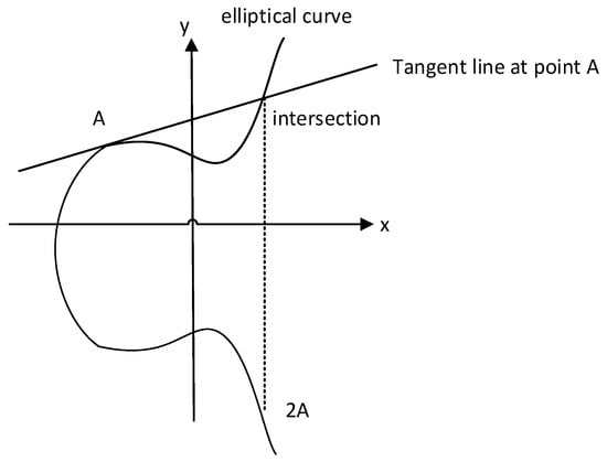 The equation of the elliptic curve used in SM2 is in the form , as shown in Figure 1. In this two-dimensional space, the horizontal axis represents , and the vertical axis represents . Point A on the elliptic curve is denoted as . According to the definition of multiple points on the elliptic curve, 2A is the point where the tangent at A intersects the curve again, and 3A is the sum of 2A and A. For a positive integer k, the point .