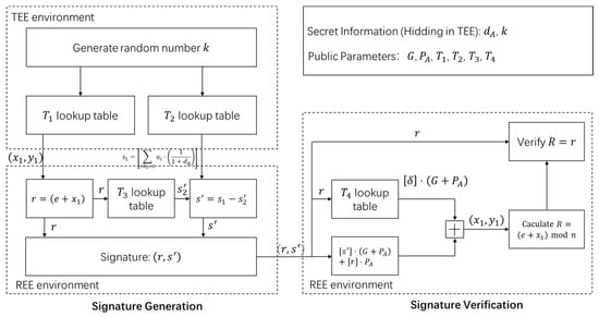 In contrast, the scheme proposed in this paper achieves white-box protection in lightweight IoT devices. It includes functionalities for signing and verifying signatures using the SM2 algorithm, ensuring strong security. The white-box protection of the SM2 private key is achieved by introducing a TEE-based random number protection scheme and a lookup table-based key hiding scheme, resisting white-box attacks on the signature process. During signing, the signer uses TEE-generated random numbers and the lookup table for signing. TEEs have become widely used in confidential computing [,]. These technologies ensure secure execution even in compromised environments and are crucial for protecting sensitive data during processing [,]. However, there are still significant challenges in securing TEE implementations, particularly regarding memory encryption and side-channel attacks [,]. During verification, the signer uses the generated lookup table for verification. Throughout the process, there is no leakage of the private key, and attackers cannot obtain the private key through white-box attacks. This dual protection at both hardware and software levels significantly enhances security performance.