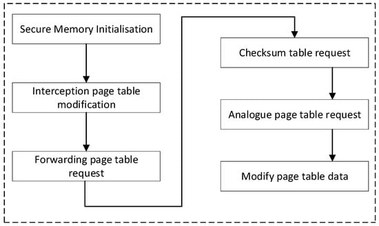 The protection flow within the TEE, as shown in Figure 4, is divided into three parts: secure memory initialization, page table request forwarding, and page table data modification.