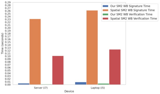 In Figure 6, the time taken for signature and verification operations is plotted for both methods on a server with an Intel i7 processor and a laptop with an Intel i5 processor. The results clearly show that our method significantly outperforms the space-hardness-based method in terms of computational efficiency, with notably lower signature and verification times across all tested devices.