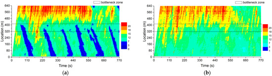 The spatiotemporal diagram of traffic breakdown from free flow to congested flow on an open road with a rubberneck bottleneck. The color bar indicates speed (unit: m/s). The vehicle trajectories between [0.9Lroad − 400, 0.9Lroad + 240] m are plotted. The locations are relocated to [0, 640] m and the bottleneck is located at x = [300, 400] m. (a) prub = 0.2, drub = 1.5 m/s2 and hrub = 1.5 s. (b) prub = 0.2, drub = 1.5 m/s2 and hrub = 3 s.