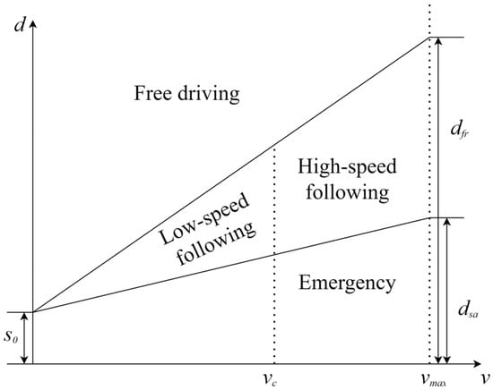 The four regimes are divided according with a relation between gap and speed of vehicles, as higher speed requires longer distance to emergently brake. The parameter dsa is the minimum safe space gap; if the actual gap between two vehicles is smaller than dsa, the following vehicle is required to brake for preventing collision. The parameter s0 is bumper-to-bumper distance in jam, dfr is the space gap boundary between the free driving state and car-following state, vc is the critical speed that divides traffic states as free-flow and traffic jam, and traffic flow with a speed larger than the critical speed represents free-flow; otherwise, it represents traffic jam. The critical speed can be derived from the fundamental diagram [61].