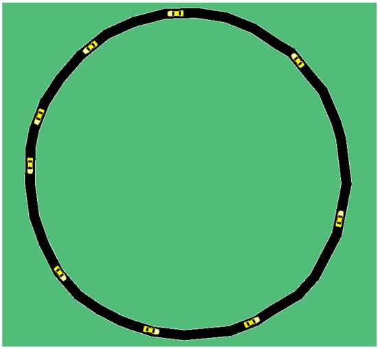 Firstly, simulations on a circular single-lane road with the length Lroad = 3500 m are conducted. Initially, cars with density k on the road are populated on the road with different initial distributions: (1) all cars are distributed homogeneously on the road with speed vmax; (2) all cars are in a mega-jam with speed zero. The simulation environment is shown in Figure 4.
