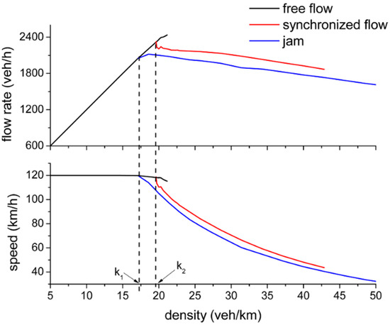 Initially, it is assumed that the single-lane road with the length Lroad = 3500 m is filled with uniformly distributed cars with the density k and speed vmax. We would like to mention that when the density is below the threshold k1, the traffic speed in the stationary state is very close to the maximum speed. For more details, see Figure 4. For the leading car, it will be removed when going beyond Lroad. Its follower becomes the new leading one and moves freely. In the simulation, a virtual detector is placed at the location xupstream = (0.9Lroad − 300) m to collect the traffic data.