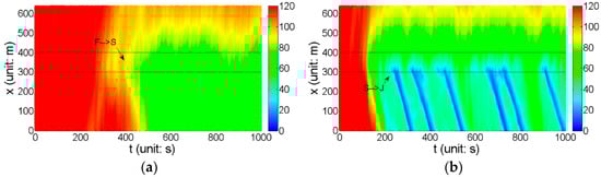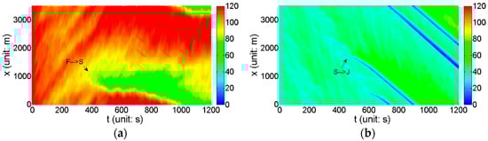 However, those traditional models have been questioned in the last two decades. Based on the empirical data [36,37,38,39,40,41], Kerner claimed that jam (J) should be regarded as an independent phase, in which the average speed is very low (~0 km/h) and the density is very high (~ρjam). Congested flow excluding jam is named as synchronized flow (S). Figure 1 shows an example of the NGSIM trajectory data on Lane 1 (the leftmost lane) and Lane 4 on the US 101 highway. On Lane 1 (Figure 1a), the formation and development of six jams in the synchronized flow can be clearly observed, although it is difficult to precisely define the quantitative speed and density criteria of the jam, while, on Lane 4 (Figure 1b), the synchronized flow emerges and no jam occurs. More empirical observations of synchronized flow can be found in various countries, such as Germany [40,42], the UK [43], Singapore [44], Iran [45], and China [46,47].