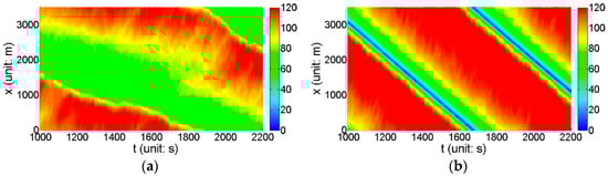 Simulation results of the spatiotemporal diagrams on a circular road with same density k = 26 veh/km under different initial distribution: (a) homogeneous; (b) mega-jam. Speed is indicated by the color bar (km/h).