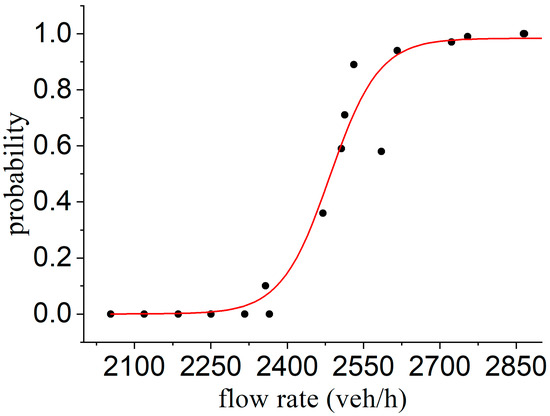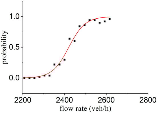 The plots of the traffic breakdown probability versus flow rate with rubbernecking bottleneck. The fitting logic functions with p = 1.00, xc = 2420, θ = 0.03 for red curve.