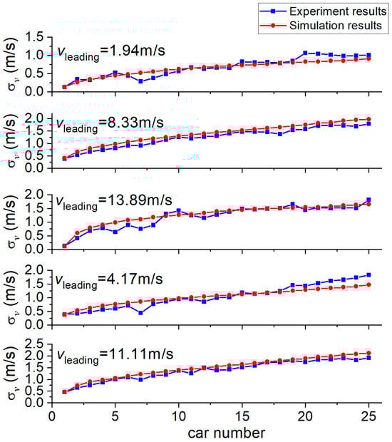 We verify the concave growth mode of speed standard deviation in the model with car-following experimental data collected by Jiang et al. [49]. With a platoon of 25 cars, the experiments were conducted on a 3200 m road section. There is no traffic light in this section, which has three lanes in each direction. The section was not closed to traffic at the time of the experiments. Nonetheless, there was little interference from other vehicles since the traffic flow was very low and no other vehicles ever cut into our platoon during the experiments. During the experiments, each car is equipped with high-precision difference GPS devices, whose measurement errors are less than ±1 m for position and ±1 km/h for speed. In each run of the experiments, all vehicles moved along the same lane and lane-changing was forbidden. The leading car of the platoon was required to drive at a constant speed. Other drivers are asked to follow their leader and drive as usual. They do not know how the leading car moves. When the platoon arrived at the end of section, the cars made a U-turn and a new run of experiment started. For more details, one can refer to Jiang et al. [50].