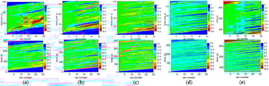 The spatiotemporal patterns of the platoon traffic. (a–e) are experimental results (upper) and simulation results (lower) from 13.89 to 1.94 m/s. The color bar indicates speed.