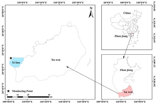 The monitoring system was deployed in a gravity-type deep-sea cage located in the offshore area of Xilian, Xuwen County, Zhanjiang City, Guangdong Province, China, as shown in Figure 2. The observed water parameters included water temperature (WT), salinity (SAL), chemical oxygen demand (COD), pH, dissolved oxygen (DO), ammonia nitrogen (NH3-N), nitrite (NO2−), and active phosphate (AP). The observed meteorological parameters included relative humidity (RH), atmospheric pressure (PRESS), wind speed (WS), wind direction (WD), solar radiation (SR), and precipitation (PRECIP). The data collection period spans from 1 May 2023 to 30 September 2023, totaling 153 days. Water quality parameters were collected every 30 min, while meteorological parameters were collected every hour.