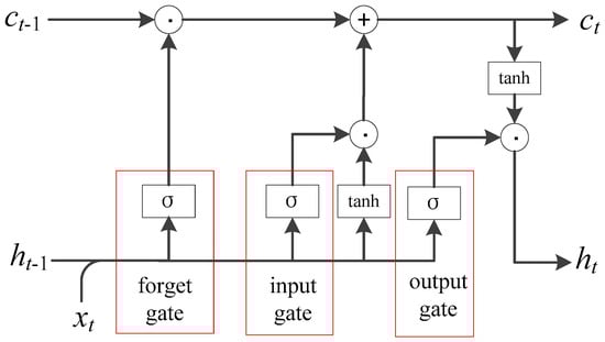 Long short-term memory (LSTM), by introducing unique gating mechanisms and memory cells, is capable of capturing dependencies over long time spans. The basic structural unit within LSTM is illustrated in Figure 4. The gating mechanisms consist of a forget gate, an input gate, and an output gate, which determine the flow and update of information at each time step. The forget gate decides which information in the memory cell should be forgotten. The input gate determines how much new information from the current input will be added to the memory cell. The output gate decides which information in the memory cell should be output as the hidden state for the current time step and passed to the next time step. The memory cell is the core of LSTM; through the gating mechanisms, it can selectively save, update, or delete information, thereby transmitting long-term information without being affected by the vanishing gradient problem.