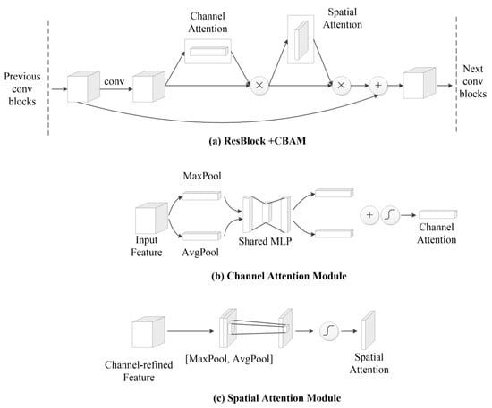 The convolutional block attention module (CBAM) is a lightweight and efficient attention mechanism module that combines both spatial and channel dimensions. Embedding the CBAM in ResNet can help ResNet better focus on important features, enhance its feature representation ability, and improve its efficiency and accuracy in processing information. Figure 5a depicts the overall structure after adding the CBAM to ResNet. Given an intermediate feature map, the CBAM sequentially infers attention maps along the two independent channel and spatial dimensions; then, it multiplies the attention maps with the input feature map to perform adaptive feature refinement.