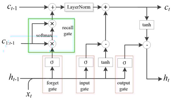 In the hidden layer of LSTM, each time step receives an input and the cell state from the previous time step, meaning that the current state of the layer depends on the state from the previous moment. For tasks with large temporal spans in time dependency, this “one-step” temporal dependency may limit the LSTM’s ability to model the dynamic characteristics of sequential signals. To achieve balanced control between learning short-term dependencies and long-term representations, in this study, a self-attention mechanism is introduced into the LSTM, with an additional recall gate added to capture the correlation between the current memory state and a certain past period, allowing the network to learn the influence weight of the state from a certain past period on the current state. Thus, by improving the recurrent transition function of the memory state, the update of the current memory state depends not only on the current input and the hidden state from the previous step but also on the fusion of the previous memory and the memory from a certain past period. The structure of the LSTM unit with the added recall gate is shown in Figure 6. The operation of the recall gate is shown in Equation (11), and the update of the current memory state is shown in Equation (12).