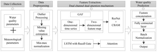 The proposed hybrid model comprises two parallel feature extraction channels: the ResNet and LSTM. In the ResNet channel, the GAF method is utilized to convert one-dimensional time-series data into two-dimensional grid point data that are well suited for processing by the ResNet. The ResNet is combined with the dual mechanisms of channel attention and spatial attention, enabling the model to adaptively and dynamically focus on environmental variables and critical moments that have a greater impact on the predicted water quality parameter, thereby enhancing the model’s feature representation ability. In the LSTM channel, a recall gate attention mechanism is introduced at the input end to enhance the temporal correlation of the data, and a global attention mechanism is introduced at the output end to emphasize the influence of certain important moments throughout the time series, comprehensively strengthening the model’s extraction of temporal features. Subsequently, fully connected layers are used for feature dimensionality reduction, and batch normalization is introduced to improve the network’s generalization performance. Finally, an end-to-end Dual-Channel and Dual-Attention ResNet-LSTM hybrid model, abbreviated as DDA-ResNet-LSTM, is established for water quality prediction, as shown in Figure 7.