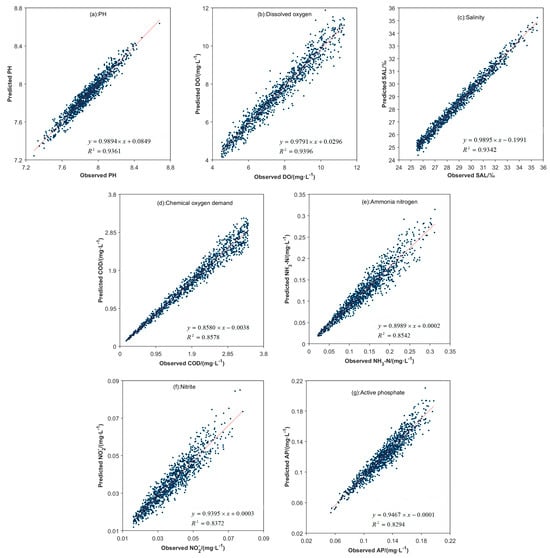 Scatter plots of predicted versus observed values for 7 water quality parameters on the test set. (a) pH; (b) DO; (c) SAL; (d) COD; (e) NH3-N; (f) NO2−; (g) AP.
