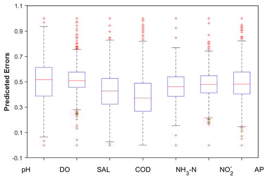 Boxplot of the min–max normalized errors between predicted and observed values for 7 water quality parameters on the test set. The positions of the ends of the rectangular box in the diagram correspond to the upper and lower quartiles (Q3 and Q1) of the data, respectively. The line segment inside the rectangular box represents the median of the data. The uppermost and lowermost line segments are located at Q3 + 1.5IQR and Q1 − 1.5IQR, respectively, where IQR (Interquartile Range) is Q3 − Q1, representing the cut-off points for outliers. The red plus signs indicate the presence of outliers.