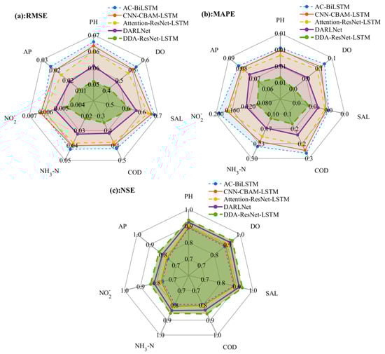 Spider plots of prediction performance metrics for different water quality prediction models for comparison experiment. (a) RMSE; (b) MAPE; (c) NSE.