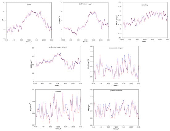 Comparison of predicted and observed values for 7 water quality parameters on 1 October 2023. The blue line represents the observed values, while the red line represents the predicted values. (a) pH; (b) DO; (c) SAL; (d) COD; (e) NH3-N; (f) NO2−; (g) AP.