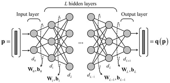 where , , are the activation function, weight matrix, and bias vector of lth layer, respectively. Without a loss of generality, and indicate the input and output vector of the DNN, respectively, and the number of nodes of each vector is and , respectively. As the activation functions, we adopt the rectified linear unit (ReLU) for the input layer and hidden layers. Namely, the ith element of the output vector of th layer, , , , is given by
