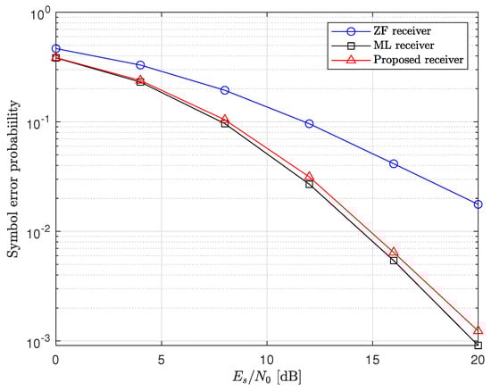 Considering (5), searches through all candidates in are necessary, and this results in exponentially increasing computational complexity with . Instead, the ML receiver can achieve an diversity order, potentially resulting in better error performance compared to the ZF receiver.