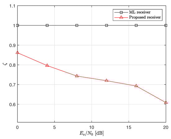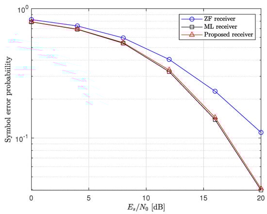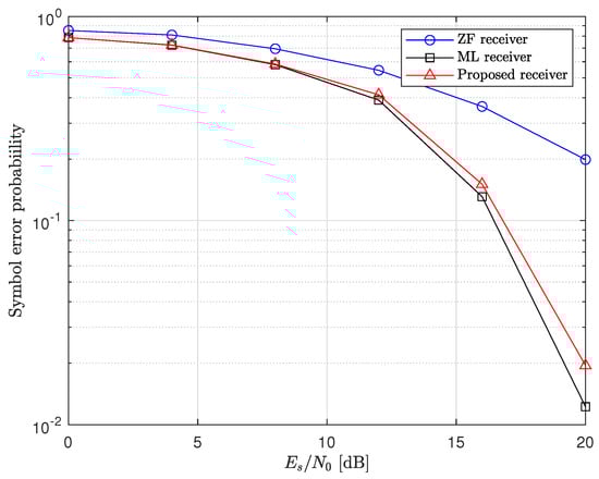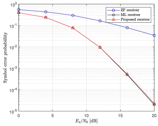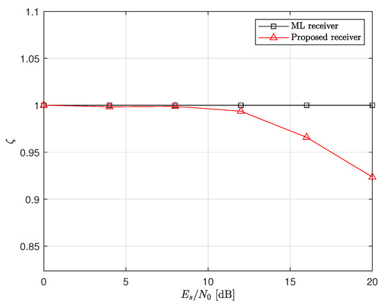 Considering that the ML receiver is adopted if the ZF receiver cannot guarantee a certain level of SER performance when the MIMO channel is given, increasing the threshold leads to higher . Namely, using a value of that is too large or too small would cause the proposed receiver to operate as the ZF receiver or the ML receiver, respectively. Therefore, it is important to use the appropriate threshold to compromise between error performance and computational complexity.