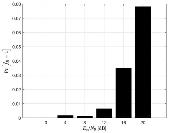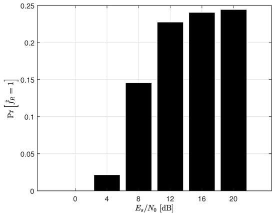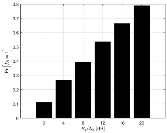 Figure 7, Figure 8, Figure 9 and Figure 10 depict the probabilities of , which means that the ZF receiver is used in the inference phase. It is shown that the probability in the low SNR region is much lower than that in the high SNR region. This implies that noise enhancement is critical, requiring more frequent use of the ML receiver in the low SNR region. In the high SNR region, on the other hand, increased use of the ZF receiver is feasible. Therefore, we can conclude that the proposed receiver accurately reflects the reduced effect of noise enhancement in the high SNR region, allowing for the correct selection of the receiver type. Comparing the and MIMO systems, we can notice that the probabilities of for the MIMO system are higher than those of the MIMO system. This is because the probability of the poorly conditioned channel of the MIMO channel is relatively higher than that of the MIMO channel. Taking into account that as the number of antennas increases, the ratio of the largest to the smallest singular values of the MIMO channel is also expected to increase, this result is reasonable.