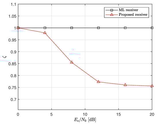 As explained in Section 2, the ZF receiver and ML receiver have and of diversity order, respectively, and this implies that the gap in SER performance between the two receivers widens as the SNR increases. To reflect the SER gap according to SNR, we set the scaling factor as follows: