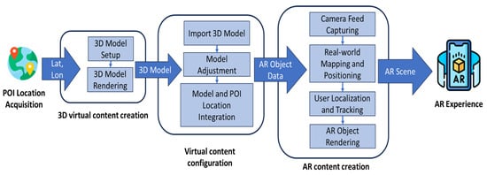 In [23], Huang et al. describe that a LAR system is composed of multiple components and substantial efforts are required to create comprehensive AR experiences. The reconstruction of an environment can be achieved through various methods that involve different technologies. Pre-defined virtual model configuration and setup can provide additional layers of information. This process may use different interaction methods, such as a desktop or mobile setting. In LAR applications, the process of aligning and matching virtual objects with geographic locations and orientations of the real-world scene is called geo-registration [24]. Figure 1 illustrates the general process of LAR geo-registration from the POI location acquisition for the AR object generation.