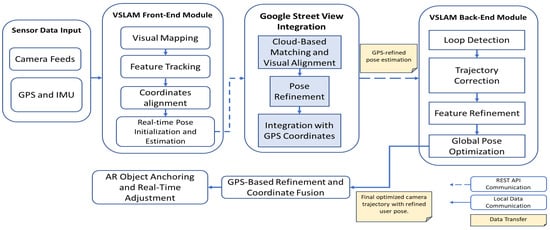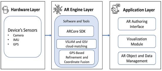 The AR engine layer serves as the core computational module of the proposed authoring tool. It provides the software libraries, frameworks, and development kits. In this paper, we use ARCore SDK for Android (version ) to access and process sensor data, map the user’s environment, and render 3D objects in real-time. The VSLAM module uses visual mapping and feature tracking to detect key points in the camera feed, estimating the user’s pose and aligning GPS coordinates. The processed data is then sent to the GSV integration module for additional visual alignments. The refined pose information is used in the VSLAM back-end module for trajectory corrections, loop detections, and global pose optimizations to minimize localization drifts. Throughout this process, the proposed LAR authoring functionality allows user-defined metadata input and visual adjustments, ensuring the accurate placement of virtual objects within the environment.