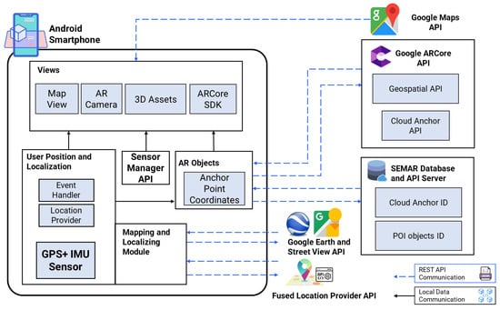 The AR Objects module manages virtual elements that are integrated into the AR scene. Each object is linked to the anchor point coordinate, which is computed using the user’s location and orientation data. The coordinates are synchronized with cloud-based services through Google ARCore’s Cloud Anchor API. The persistent data of AR content is stored on the SEMAR server [45], which holds the anchor ID, latitude, longitude, altitude, heading, and other related data of each created AR object. The Google ARCore SDK is employed as an AR engine to generate virtual object visualization in real-world coordinates. Data transfer between the smartphone and external services is facilitated by REST API communications, while local data communications are used to handle internal processes within the device.